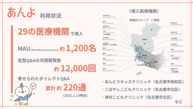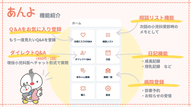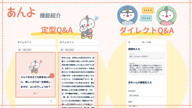 ジークスは、2021年2月からの医療法人葵鐘会との実証実験を経て、子育て医療アプリ「あんよ」(https://annyo.jp/)を同年9月にローンチいたしました。昨今ではお産を終えたお母さんの産後うつが社会問題となっていますが、特にコロナ禍で周りの人との関わりが少なくなってしまった結果、子育てに関する悩みを家庭内で抱え込み、日常的な悩みの解決をインターネット検索に頼らざるを得ない状況となっています。そこで当社は、小児科医による”新生児・乳児期のよくある質問に対する回答”をまとめた定型Q&A、小児科医へ一問一答形式で質問できるダイレクトQ&Aなどをアプリ「あんよ」を通じてユーザー様へ提供しています。