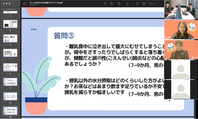 昨年10月に、「小児科医への質問会&産育休者座談会」をオンラインで開催し、ロート製薬の育休中の社員13名にご参加いただきました。