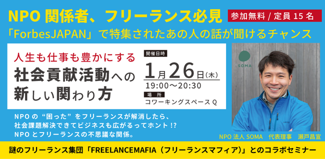 ビジネス誌ForbesJAPANでも特集されたNPO法人SOMA(福岡県福津市 代表理事:瀬戸昌宣)と福岡を拠点に活動する謎のフリーランス集団FREELANCEMAFIA(フリーランスマフィア)は、NPOとフリーランスが協業することで社会課題解決をスムーズにし、人生も仕事も豊かにできる「社会貢献活動への新しい関わり方」のセミナーを2023年1月26日(木)19:00~20:30、コワーキングスペースQ(JR博多駅地下1F)にて開催いたします。