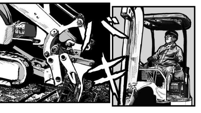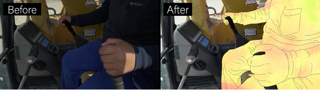 A:手を抜かずに緻密に重機を再現し、色使いなど非現実的に仕上げたました。迫力あるロトスコープはあまり例がないと思うのでダイナミックな感じが伝われば嬉しいです。