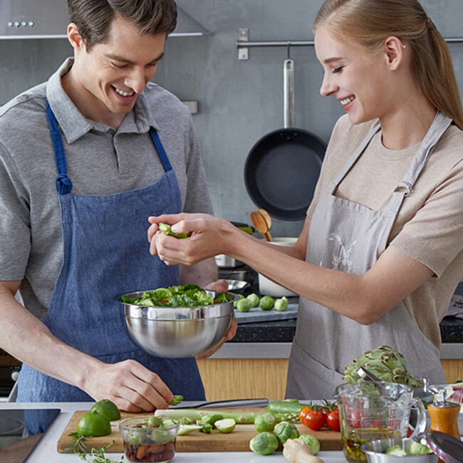 ステンレス製のボウルは、軽くて使い勝手が良く耐久性も高い素材であるが、電子レンジやオーブンで使えないといった調理工程における課題があった。この課題を解決したのがクイッティサンである。