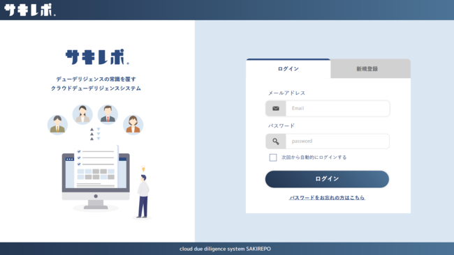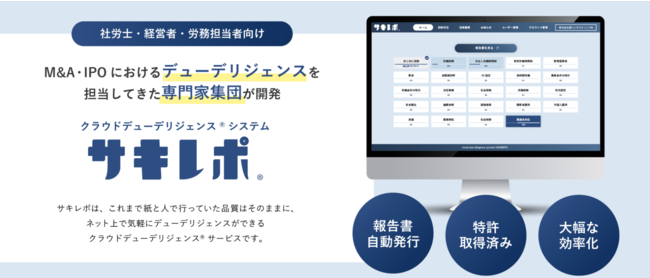 代表取締役の谷川が労務コンサルタントだった時代の経験を元に、誰でも気軽にデューデリジェンスができる世界を実現するため、クラウドデューデリジェンスシステムであるサキレポを開発。リリース直後から多くの社労士に導入されており「顧問先の課題を見える化し信頼関係を強化できた」「新規案件を獲得できた」とのお声を多数頂く。一方、ベンチャー企業からも「調べる手間と判断する手間が大幅に削減できた」「低コストで使いやすい」等のお声を頂く。今後も積極的に展開し、順次機能拡充予定。
