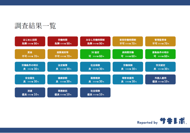 「サキレポ」は、これまで紙と人で行ってきた品質はそのままに、ネット上で気軽にリスク調査ができるクラウドデューデリジェンス(R)サービスです。これまで膨大な人的コストがかかっていたデューデリジェンスをクラウド上で行うことで労務コンプライアンスを見える化。アンケートのように質問に回答するだけでリスク度・改善項目の把握とレポート(報告書)の自動発行が行えます。