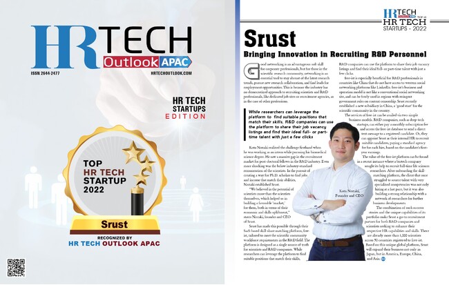 大学等の研究機関或いは企業に勤める研究者に特化したAIマッチングプラットフォームを開発する株式会社Srust(東京都千代田区、代表取締役社長:野崎 光太、以下:Srust)は、世界有数のHR Techメディアである”HR Tech Outlook”より、アジア太平洋地域における2022 HR Tech Startupトップ10に選出されたことをお知らせいたします。