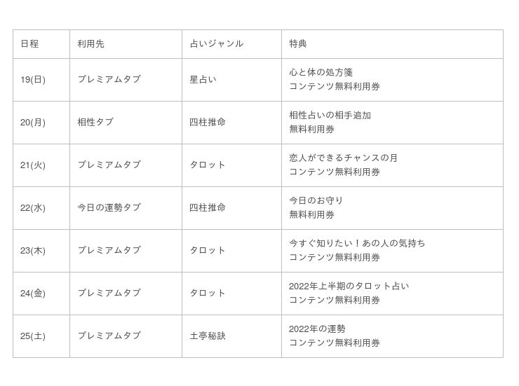 25日は【プレミアム 土亭秘訣で占う2022年の運勢】の無料利用券が支給されます。 フォーステラー占いのオリジナル土亭秘訣で一年の吉凶を占ってみましょう。