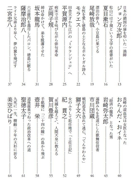<登場人物など>ジョン万次郎、夏目漱石、尾崎放哉、モラエス、平賀源内、正岡子規、坂本龍馬、薩摩治郎八、二宮忠八、おらんだ・おイネ、岩崎弥太郎、市川団蔵、獅子文六、紀 貫之、賀川豊彦、壺井 栄、聖徳太子、美空ひばり、冨士茂子、空 海、山下亀三郎、牧野富太郎、天狗 久、姜 沆、上林暁、ディック・ミネ、塩原太助、山 頭 火、寺田寅彦、蜂須賀家政、瀬山 登、一 遍、吉井 勇、曽我廼家五九郎、西 行、伊丹万作、大町桂月、海野十三、宮武外骨、高浜虚子、絵 金、吉川英治、笠置シヅ子、河野通有、幸徳秋水、関 寛斎、源 義経、水野広徳、田中英光、北条民雄、静 御前、大和田建樹、浜口雄幸、山下奉文、板倉タカ、木村久夫、岩本千綱、岡田勢一、政尾藤吉、乃木希典、板東収容所、松山収容所、野中兼山、三原 脩、一 茶、生田花世、タカクラ・テル、岡田かめ、井上正夫、菊池 寛、鳥居龍蔵、丸山定夫、西嶋八兵衛、中江兆民、お松大権現、井上 通、森 恒太郎、槙村 浩、関 行男、小 少 将、棚次辰吉、中原淳一、高群逸枝、徳冨蘆花、崇徳上皇、江藤新平、日柳燕石、山内一豊の妻、山崎宗鑑、兵頭 精、黒岩涙香、藤堂高虎、林 はな、島木健作、藤原純友、鳥居耀蔵、山田 敬、樫尾忠雄、池田勇人、H・アイザクソン