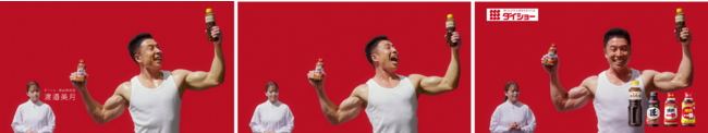 なかやまきんに君が、ダイショー商品開発部の渡邉と山下に「おい、ダイショーさん!焼肉には、にんにくしょうゆと香味野菜しょうゆ、どっちが美味しいんだい!?」と問いかけると、渡邉は「にんにく!」、山下は「香味野菜!」と違う回答を連発するCM。渡邉と山下が何度も繰り返す度に、なかやまきんに君の表情はどんどん困り果ててしまいます。