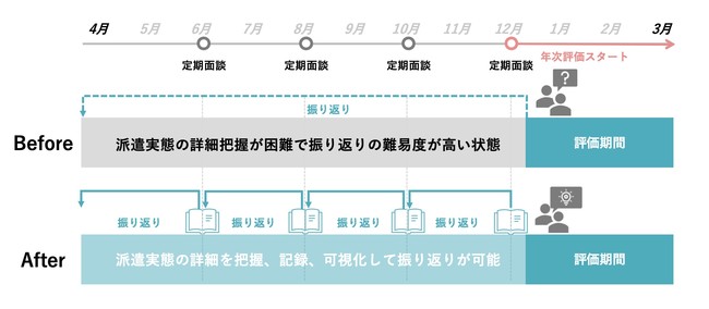 当社では、評価を効果的に行い派遣社員の処遇改善の可能性を高める為、また、派遣社員の感じている不安や今後のキャリアの希望等を把握し、安定就業へのサポートや次の派遣先への就業サポートの強化をする為にも、派遣社員との定期面談等でのコミュニケーションが大切だと考えております。