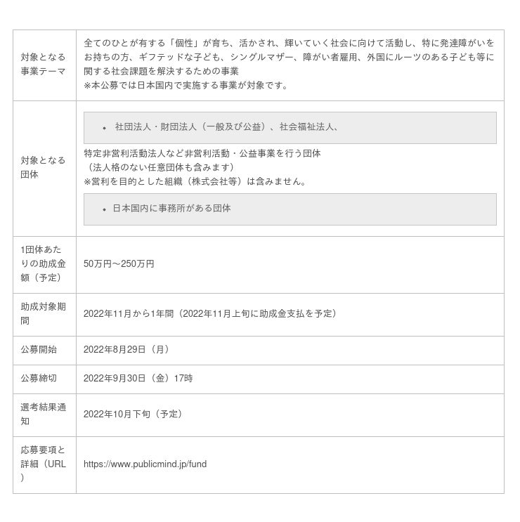 クラウドファンディングは沢山の方々から「共感」を元に資金を集める手法として有効ですが、一方で、機動的・安定的に資金を提供することができるスキームの必要性を感じたことから、今回、新たに社会的投資ファンド「Public Mind基金第1号」の運営を開始いたします。