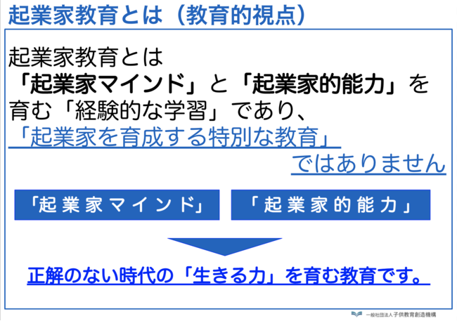 「起業家的能力」を育む「経験的な学習」であり「起業家を育成する特別な教育」ではありません 。