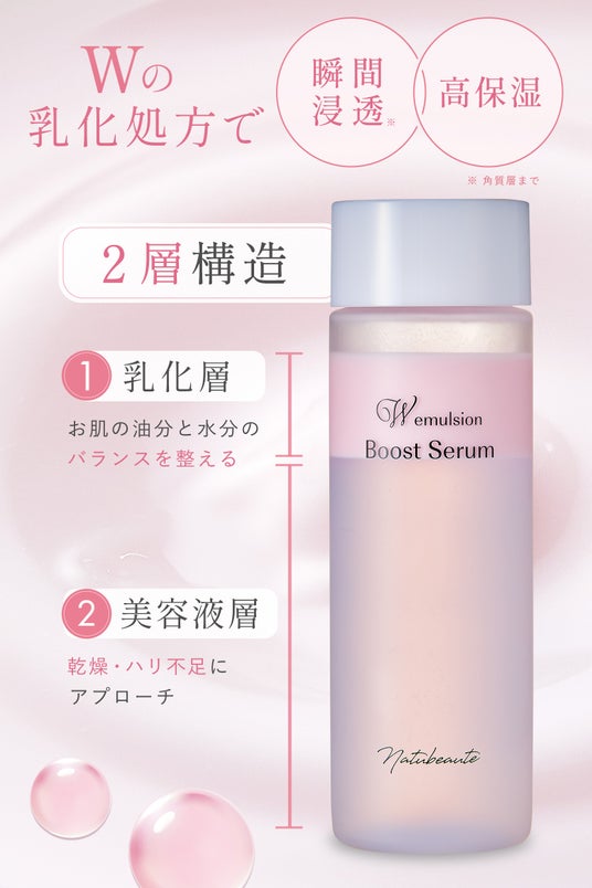 株式会社エーキューブアソシエーション(本社:大阪府大阪市:代表取締役:瀧田 和男)が展開するスキンケアブランド「Natubeaute(ナチュボーテ)」より導入美容液『ブーストセラム Wエマルジョン』を2024年9月初旬に発売致します。