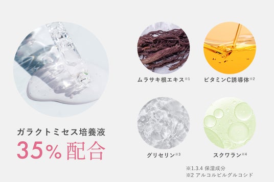 ミネラルやビタミンなどの栄養素を豊富に含み、高保湿、ハリ・弾力を与える、肌のキメを整える、トーンアップ、皮脂コントロールなど、様々な美容効果が期待できる美容成分のガラクトミセス培養液を35%配合。