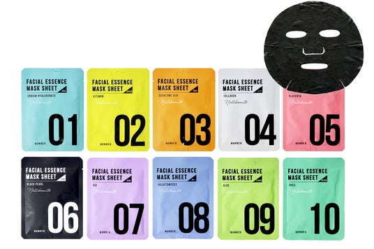 フェイシャルエッセンスマスクシート 全10種13種類の美容成分を配合したのとろみ濃厚美容液でお肌をたっぷりと潤し、翌朝実感できるしっとり肌へ導く。竹炭配合の高密着ブラックシート採用。肌コンディションによって選べる全10種類。
