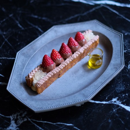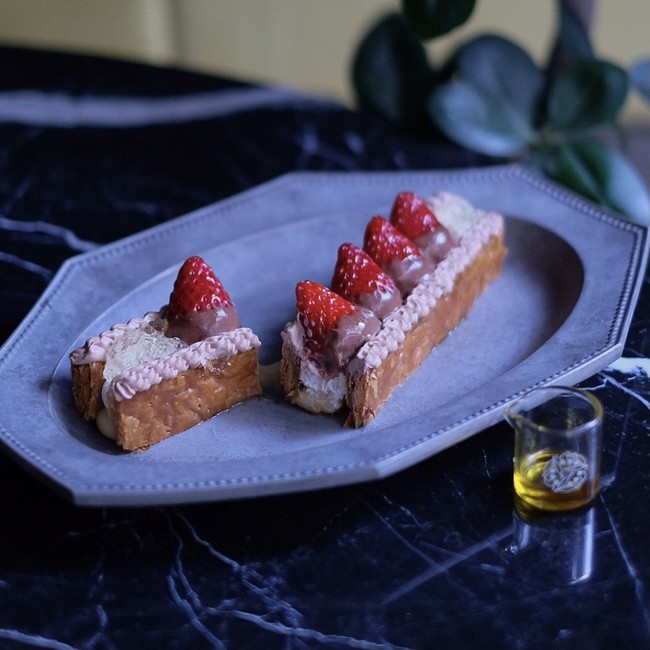 チョコレートは、Bean to Bar「カカオロジー」の香りがクセになるトリニダードトバゴ産カカオと、燻製した桜チップのスモーキーな香りが特徴の「カカオクリュ スモーク」を使用。ダイレクトに苺をディップする他、生クリームとブレンドした特製クリームでパイを縁取ります。両脇にはラムのジュレをあわせて大人仕様に仕上げました。パイにサンドする2層のクリームは苺を混ぜ込んだクリームと自家製カスタードクリーム。「セドリック カサノヴァ」の黄金色のオリーブオイル「FRCIC」を添えます。
