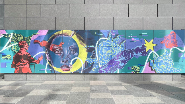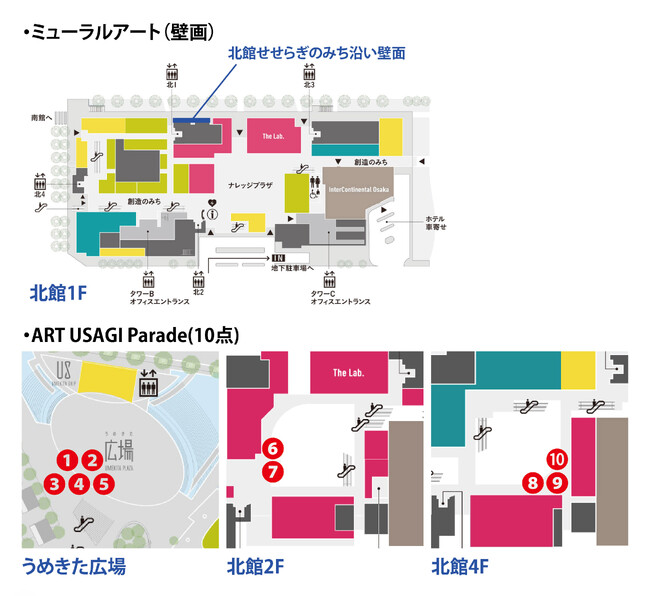 この度、第6弾として新たな作品を展示いたします。北館せせらぎのみち沿い壁面には、2組のアーティストによるミューラルアート(壁画)作品をそれぞれ展示し、これまでとは違った世界観で、グランフロント大阪の壁面を彩ります。また、グランフロント大阪まちびらき10周年記念イベント第2弾「THE GRAND TSUKIMI」(9/29~10/9)との連動企画として、「ART USAGI Parade」を実施中です。「お月見」の象徴的なモチーフである「うさぎ」のオブジェ作品を、10周年にちなみ10点、施設内各所に展示。まちを巡りながら作品を楽しんでいただけます。