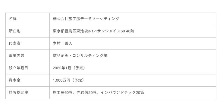 オーダーメイドの旅を提供するトラベル・コンシェルジュ・カンパニー、株式会社旅工房(本社:東京都豊島区、代表取締役会長兼社長:高山泰仁、以下旅工房)と、通信や生活インフラなどの分野で、時代に即した商品・サービスの提供をする、株式会社光通信(本社:東京都豊島区、代表取締役社長:和田英明、以下光通信)並びに多言語コンタクトセンター運営カンパニーである株式会社インバウンドテック(本社:東京都新宿区、代表取締役:東間 大、以下インバウンドテック)は、アフターコロナにおける国内外への旅行需要の回復に向け、旅行者へ新たに快適なサービス提供を目的とした合弁会社「株式会社旅工房データマーケティング」を2022年1月(予定)に設立することを決定しましたのでお知らせいたします。