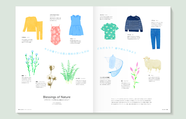 〈プチバトー〉のSDGsの取り組みを紹介するページは、ファッションをきっかけに環境保全を考えていただけるような、イラストやクイズを盛り込んだ読み物となっています。ぜひ、親子で楽しんでください。