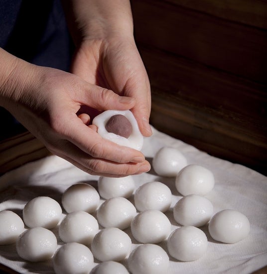 ・米は佐賀市の契約農家から⽩⽟饅頭に最適なうるち米を玄米で仕入れ、洗米する直前に自家精米しています。あんこは北海道産の厳選した小豆を上品な⽢さになるよう丁寧に練り上げています。