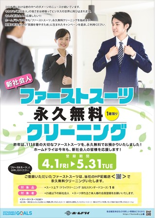 クリーニングの株式会社ホームドライ(本社:神戸市須磨区)では、昨年に引き続き「ファーストスーツ永久無料クリーニング」のキャンペーンを実施いたします。対象は25歳以下の新社会人。2022年4月1日(金)~5月31日(火)の期間中にご登録いただいたファーストスーツ1着が永久無料に!