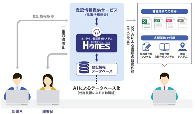 登記情報の活用と業務コストの削減を目的に開発されたクラウドサービスです。ご契約いただいたその日から、登記情報をオンラインで一括取得することが可能。また、システム内で登記情報を共有できるほか、二重取得を防止できるため、無駄な経費を削減。特許取得済のホームズAIが登記情報を取得と同時に解析し、CSVやExcelへデータ化するため、手入力による転記ミスがゼロとなるなど、大幅な業務効率化が実現できるシステム。