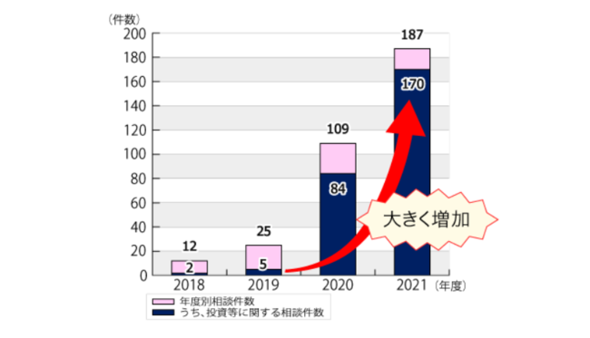 たとえば、投資に絡む詐欺被害についてみてみると、国民生活センター越境消費者センター(CCJ)によると、2018年度は出会い系サイトやマッチングアプリ等に関する相談件数12件のうち2件(約17%)だったのが、2021年度は12月31日までで187件のうち170件と、約90%を占めるほど急増しています。