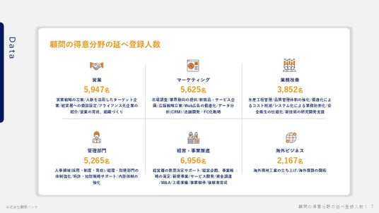 登録顧問10,000名突破を機に、最新の登録顧問データを公開します。企業の第一線で活躍してきた、経験豊富なプロフェッショナルが多数在籍しています。