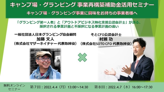 アウトドアビジネスに特化して支援を行う公認会計士 村瀬功とグランピング第一人者の加藤文人による「事業再構築補助金を活用して新規事業としてキャンプ場・グランピング事業を提案する」無料のWebセミナー。