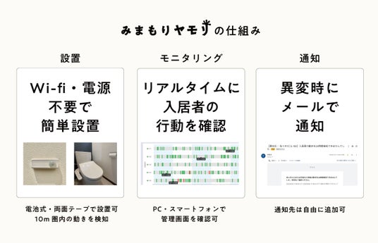 「みまもりヤモリ」が24時間の間に対象者の動きを感知しなければ、家族や道志村役場にメールにて自動的に通知が届くシステムになります。本協定では人命につながる事態を一早く拾いあげる事で本人も家族も安心して生活ができるように支援を目指します。