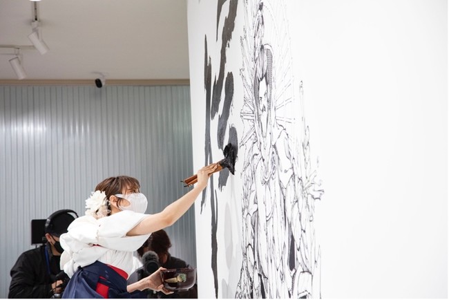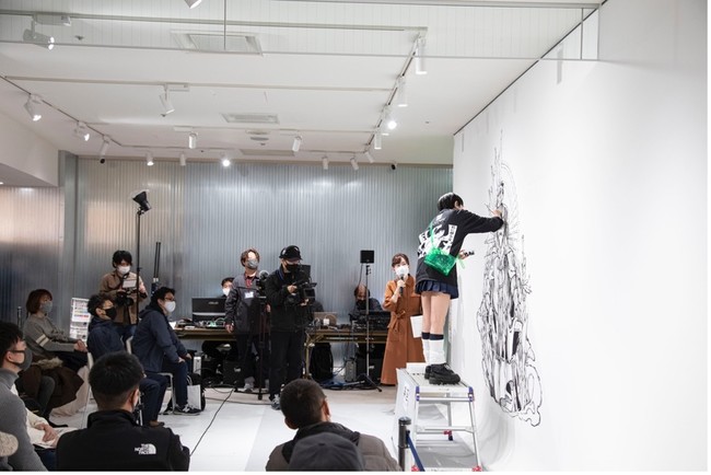 本イベントは、2021年11月 有楽町マルイ7Fに誕生した日本初のリアルNFTギャラリー「楽座マーケットプレイス・ギャラリーラボTOKYO」のオープンを記念し、超楽座のクリエーターである書道家/アーティスト「青柳美扇」氏、ライブマンガペインター「内田慎之介」氏をお招きし、トークショーのほか、ライブパフォーマンスとして内田慎之介氏のイラストと青柳美扇氏の書がコラボレーションしたウォールアートが描き上げられました。また、こちらのウォールアートのNFT化は日本初の事例となりました。