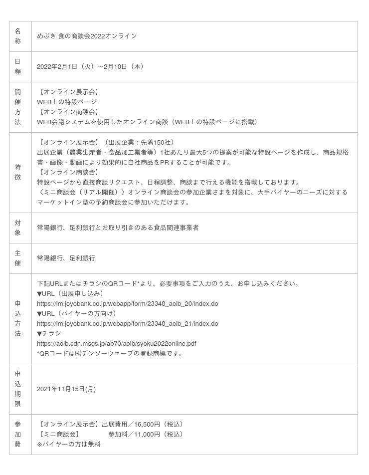 めぶきフィナンシャルグループの常陽銀行(頭取 笹島 律夫)と足利銀行(頭取清水 和幸)は、このたび、「めぶき 食の商談会2022オンライン」を開催しますので、下記のとおりお知らせいたします。