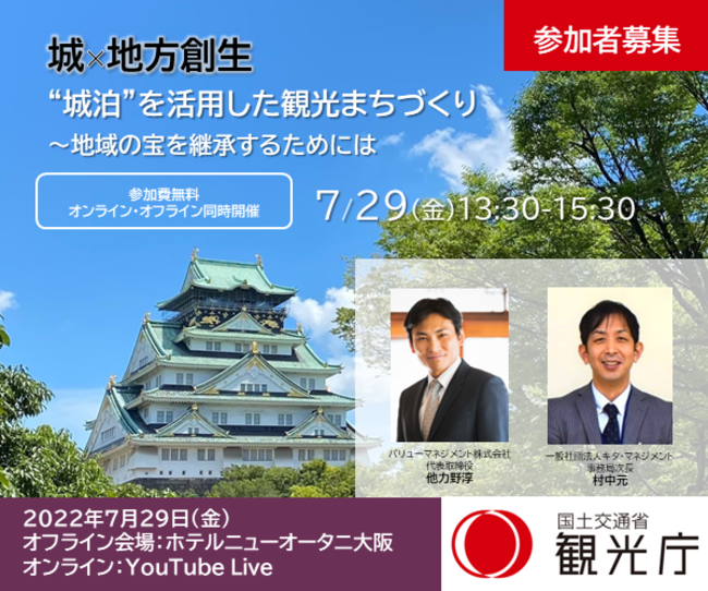本セミナーは城や城郭内の歴史的資源を保有する「自治体」、「観光地域づくり法人(DMO)」や「民間企業等」を対象としており、城泊の先駆者2名によるトークセッションを通して、これからの観光まちづくり、文化財のあり方を考えていきます。