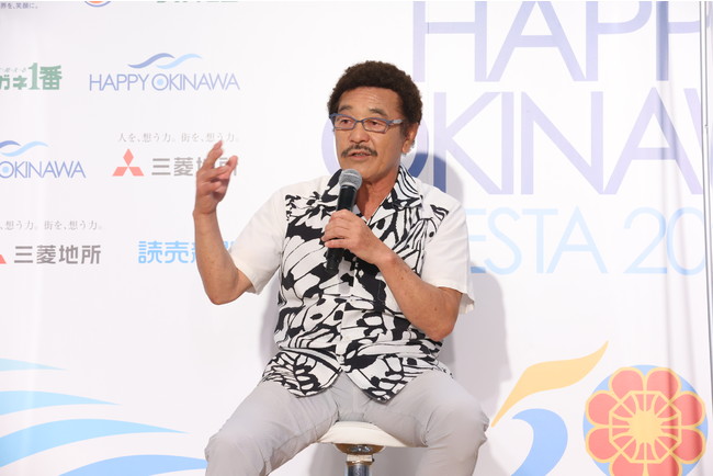 イベントの最後には、ゲストの皆様に質疑応答を実施いたしました。「沖縄県民にとって、具志堅さんはどんな存在ですか?」という質問に、MAXのナナさんは「具志堅さんは両親世代ですが、沖縄から一番最初に出た大スターというイメージです。でも今はバラエティで天然キャラで活躍されていて、親戚のおじいちゃんという感じで大好きです」と話し、24歳の西銘さんは「もう僕らの世代からしても大スターですね。今日のことも母親に自慢したいです」とレジェンドとの初共演の感想を語りました。そしてMCでお笑い芸人のゆっきーさんからは「定期的に開催される具志堅会では、夏川りみさんやISSAさんの歌声を聞いて満面のニンマリ顔ですよ」と沖縄出身芸人ならでは具志堅さんのエピソードが。これには具志堅さんも「だってタダで聞けるのうれしいんだもん」と話し、具志堅節に会場は笑いに包まれました。