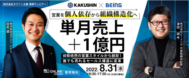 経営コンサルティング・人財育成の仕組み構築を行う株式会社カクシン(本社:大阪府大阪市、代表取締役:田尻望)は、2022年8月31日(火)株式会社ビーイング代表取締役 津田 誠氏とのウェビナーを開催致します。