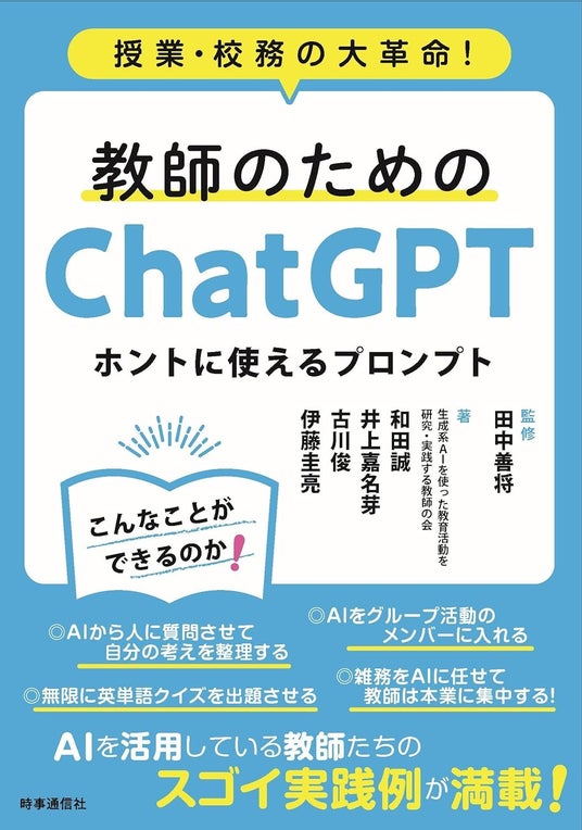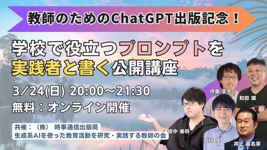 スクールエージェント株式会社(本社:東京都新宿区、代表取締役:田中 善将)は、弊社代表の田中善将が監修しました教師向けのChatGPT活用本「教師のためのChatGPT」の出版に際しまして、(株)時事通信出版局様と共催のオンラインセミナー、「 "学校で役立つプロンプト"を実践者と書く公開講座」を3/24(日)に開催することを決定しました。