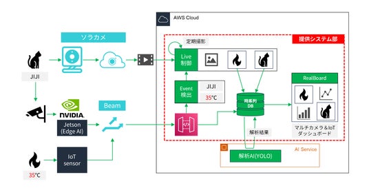 赤枠「提供システム部」と物体検知AI(YOLO)やIoTセンサとのイベント撮影の組合せ事例