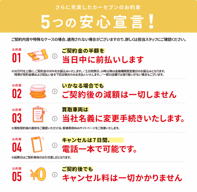 これら5つの安心宣言を通して、お客様にカーセブンを知っていただき、少しでも多くのお客様に店舗をご利用いただけるように取り組んでまいります。