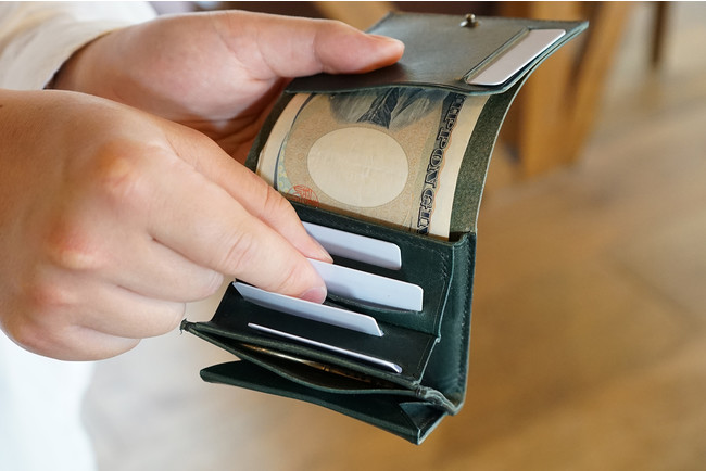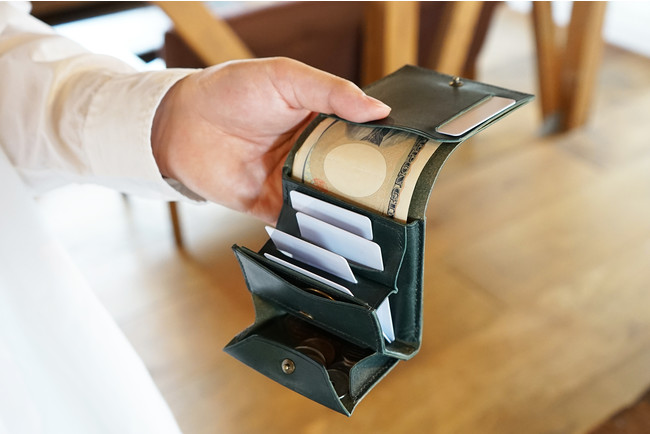 ひらくとカードが立ち、瞬時に選んでとりだせる!時短構造のスリムコンパクト財布