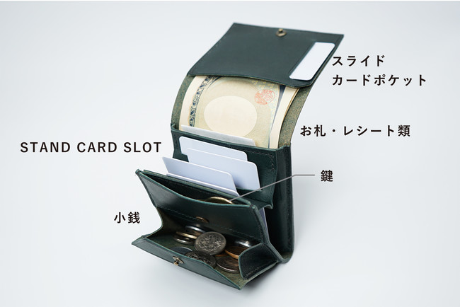 ホックを開けると、まるで飛び出す絵本のように一瞬で広がり、カードがそれぞれ独立して立ち並ぶので見やすく出し入れしやすい。キャッシュレス時代に最適でカード決済に抜群の実力を発揮する時短構造。