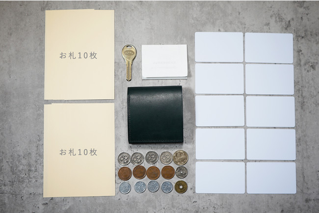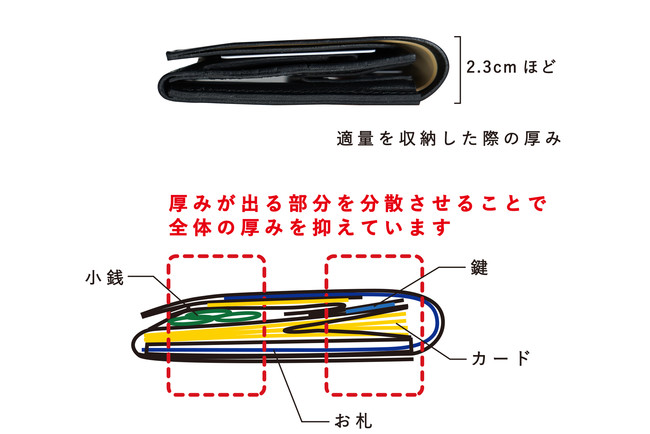 MAX容量はお札20枚、カード10枚、小銭15枚。さらにレシート5枚、鍵を1本収納可能。※適量はお札10枚、カード6枚、小銭10枚。さらにレシート2枚、鍵を1本、財布の厚みが2.3cm程度。(お使いいただくうちに、革が馴染んで厚みは少し薄くなってまいります。)
