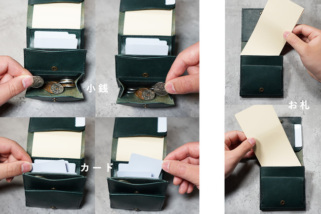 カード決済に重きをおいて、いかにスムーズに素早くカードの出し入れができるかにこだわりました。さらにカード決済だけでなく、スムーズな現金決済に対応した小銭・お札スペースや携行性を考えた「使いやすいコンパクトサイズ」。コンパクトでありながら大容量。見開きタテ持ちタイプで「お支払いの動線」を意識した、仕分け機能も充実。スムーズ&クイックで快適な新スタイルのミニ財布を開発しました