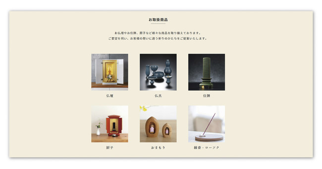 お客様の想いに適う、様々な商品・サービスのご紹介ページを新設いたしました。仏壇・仏具・位牌・厨子など、メーカー直営店ならではの幅広い商品ラインナップや、年々需要が増加している「お仏壇のリフォーム」についてもご紹介しております。併せて動画ギャラリーも設置し、本社工場や商品について、より詳しくご覧いただけるようになりました。