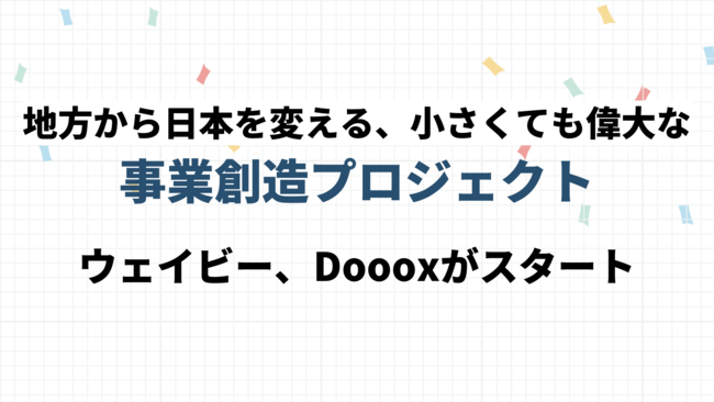 当社、ウェイビーともに地域を豊かにするという想いを持ち、全国様々な地域を舞台に、地域自治体、地域金融期間、地域企業、地域で起業したい人と取り組みをしております。Dooox、ウェイビーが共に得意とする「持続性のある」地域活性化について、それぞれのノウハウや経験値を融合することで、地域経済を成長させる支援がこれまでより精度高く可能となるため、「地方から日本を変える、小さくても偉大な事業創造プロジェクト」を共同でスタートさせます。