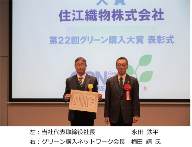住江織物株式会社(本社:大阪市中央区、代表取締役社長:永田 鉄平)は、2021年12月15日に開かれた表彰式にて、『第22回グリーン購入大賞』プラスチック資源循環特別部門 大賞の表彰状を授与されましたので、お知らせします。