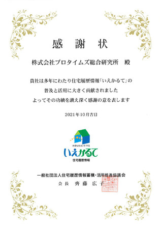 屋根・外壁のプロ「ヤネカベ」を運営する株式会社プロタイムズ総合研究所(本社:東京都府中市、代表者:大友健右、https://www.protimes-souken.com/)は、いつ、だれが、どのように新築や修繕、改修・リフォーム等を行ったかを記録し保管する「住宅履歴情報(いえかるて)」への登録数が評価され、一般社団法人住宅履歴情報蓄積・活用推進協議会より「総合貢献賞」を受賞しました。