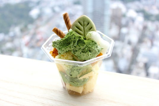 クリームに西尾の抹茶を混ぜこみ、スポンジと重ね合わせました。抹茶のほろ苦さと香りを楽しめるパフェです。