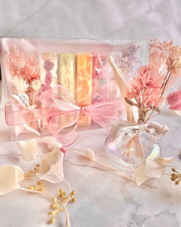 ドライフラワーとプリザーブドフラワーを組み合わせたブーケが入ります(ハート)ブーケはそのまま飾っていただいても、アロマオイルとスティックと一緒に小瓶にいれてディフューザーの飾りとして使っていただいてもかわいいです。