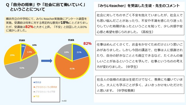 集まった寄付はすべて、若者たちの未来を生き抜く力を育む『みらいteacher』事業(学校で実施される職業講話や職場体験など)に充てられ、10代の若者の自己肯定感を醸成し、将来への“希望”を育てます。