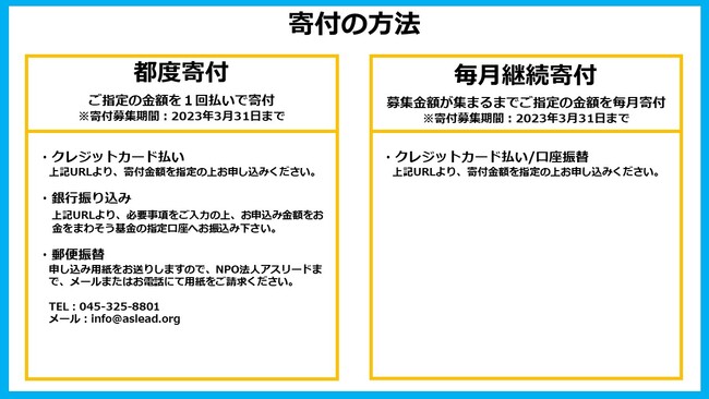 ※公益財団法人お金をまわそう基金は特定公益増進法人のため、お金をまわそう基金を通したNPO法人アスリードへの寄付は、特定寄付金として寄付者が確定申告することにより税制優遇措置を受けることができます。