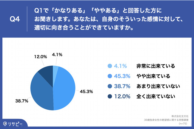 Q1で「かなりある」「ややある」と回答した方に、「Q4.あなたは、自身のそういった感情に対して、適切に向き合うことができていますか。」(n=75)と質問したところ、「あまり出来ていない」が38.7%、「全く出来ていない」が12.0%という回答となりました。