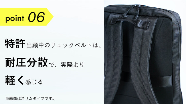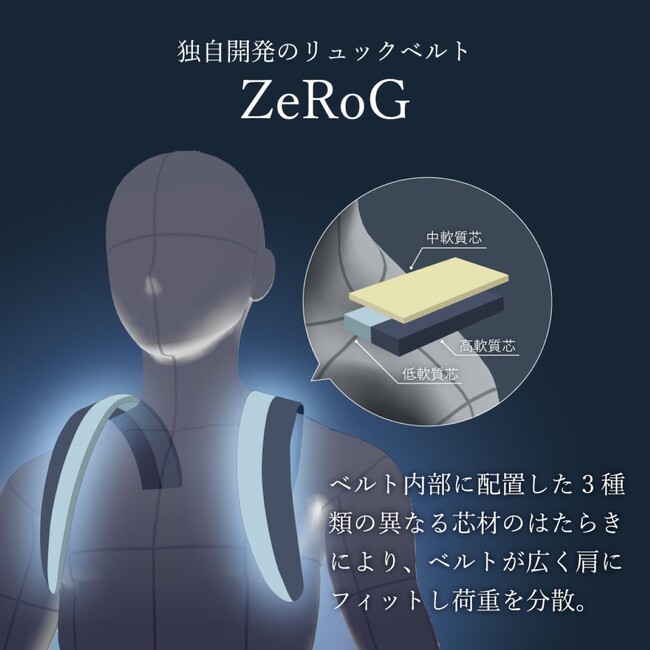 RAIZON(レゾン)ビジネスリュックのショルダー部分には自社オリジナルで開発し、特許申請中のベルトを採用。高機能なバッグに採用されているクッション性の高いショルダーは、どうしても価格が高くなるので、RAIZONのような価格帯の商品に採用ができにくい背景がありました。われわれはファクトリーブランドですので、その部分の強みを活かし、手の届く価格で機能搭載を実現できました。それが自社開発したショルダー「ZeRoG(R)」になります。荷物が多くなったり、重たくなっても、独自の構造により耐圧分散率を高め、肩や体全体への負担を減らすことに成功。